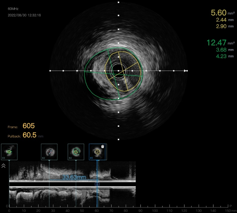李怡教授使用该系统成功指导了一例前降支次全闭塞病例的PCI治疗。术中李怡教授通过IVUS细致地观察了患者前降支的近中段病变部位,在高清图像下对病变部位的管腔面积与斑块负荷等信息作出了详细的分析,并在成功为患者植入支架后,进一步对支架的植入效果进行了全面的评估及优化。李怡教授表示60MHzIVUS导管所生成的高清图像及管腔智能识别技术的辅助,给手术医生创造了更高效的读图分析环境,其功能的精准程度超出预期,令人印象深刻。