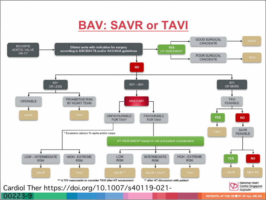 统计数据显示,二叶瓣的患者相对更年轻,因此出现外科换瓣术后Valve in Valve手术的可能性更大,而且需要尽可能避免起搏器植入、保留冠脉通路等,以期达到更为完美的结果;此外,二叶瓣患者的近亲中,出现二叶瓣的比例相对更高,合并升主动脉扩张需要进行主动脉根部置换术的风险更大,术中发生瓣周漏、术后出现瓣膜血栓的风险也更高,这些因素都决定了术者在制定手术方案的时候需要更为慎重。基于此,Kay-Woon Ho教授详细解读了二叶瓣患者选择外科手术(SAVR)还是TAVR的决策流程图。