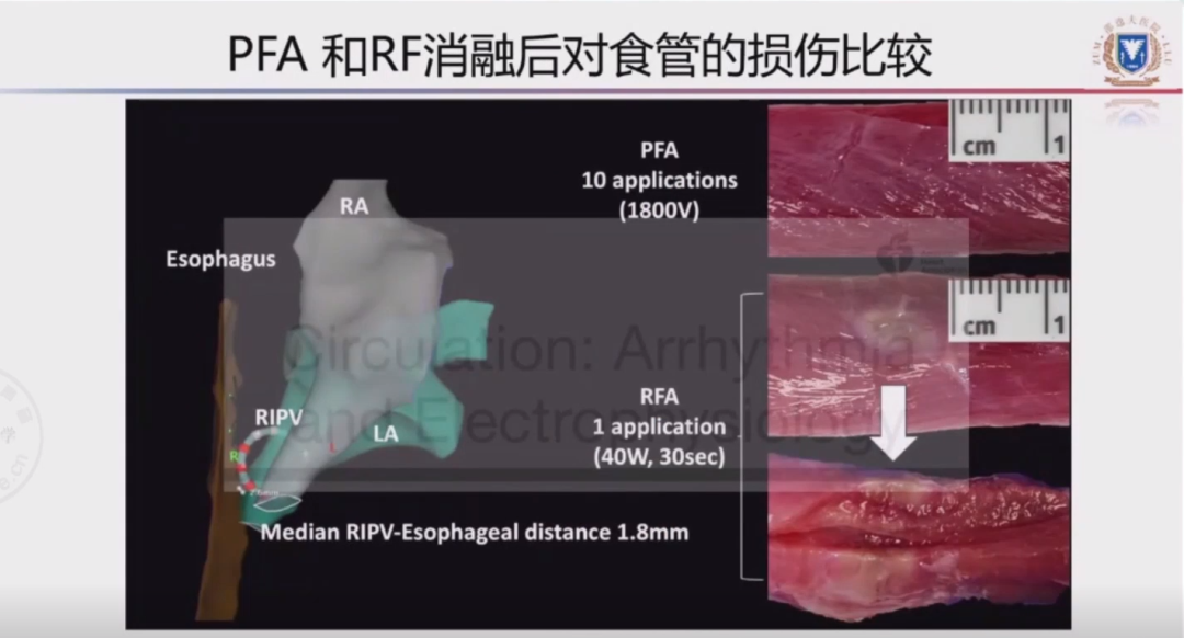 他指出,在动物实验中,PFA作用于右房后壁的效果十分明显。上千伏的电压能在瞬间释放,后面借助右房后壁线激动标测他和团队清晰的看到了消融前、消融急性期、消融30天后发生的传导阻滞,右房后壁在此期间也连续保持低电压状态。值得一提的是,资深电生理医生在使用射频能量消融右房后壁至少要耗时5分钟左右,而使用PFA则仅需14秒就能有良好的生物学效应。过一段时间再对动物进行解剖,也可以看到PFA对食管、膈神经的影响几乎为零。