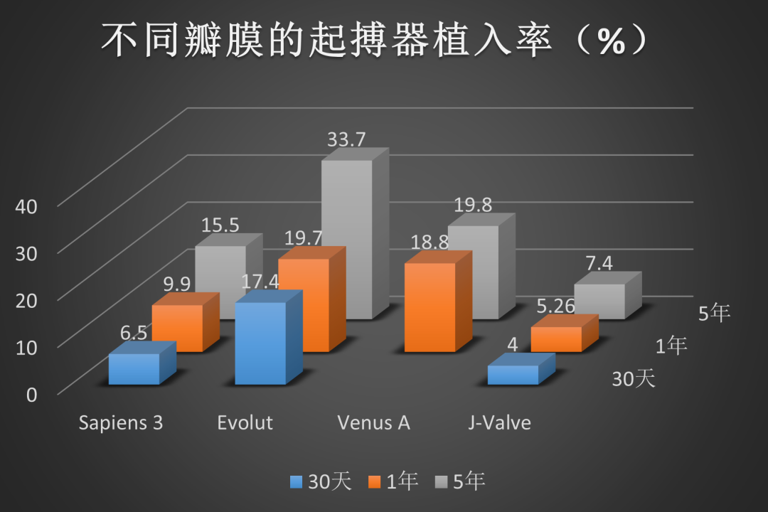 对主动脉瓣环、左心室流出道和膜间隔(传导系统所在的位置)施加更高的径向力可能会降低瓣周漏的风险,但会增加传导异常的风险。自膨胀和球扩式瓣膜都有可能会导致需要新的永久性起搏器。以美敦力为代表的的长支架瓣膜的起搏器发生率更高,主要原因之一是长支架自膨式瓣膜需要以较大的尺寸进行oversize,而球扩瓣的oversize程度较少。这种结果同样可以从一些其他设计的瓣膜中体现,如J-Valve在选择瓣膜时更多选择等size或者downsize尺寸瓣膜,其30天起搏器发生率(4%)远低于Evolut(17.4%),同样也低于球扩瓣(6.5%)。