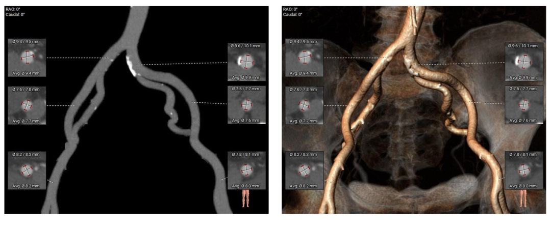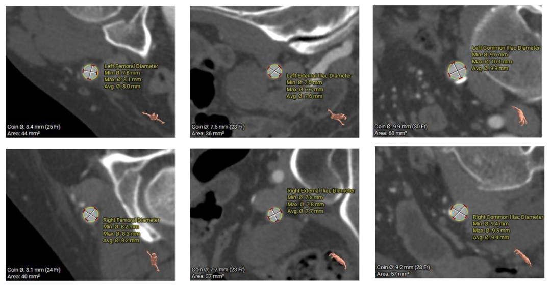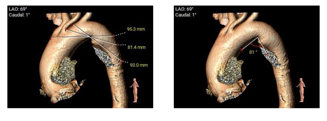 Type-0型二叶瓣,中-重度钙化伴瓣叶增厚,左冠开口高度偏低,右冠开口高度可,左冠瓣叶长度略大于冠脉开口上缘与瓣叶附着缘距离,左室流出道整体呈直筒型,瓦氏窦,窦管交界,升主动脉内径可,左室腔内径可,心室壁增厚,主动脉瓣环与水平面夹角51度,非横位心,主动脉弓距、弓角可 -双侧入路血管走形良好,整体入路条件可