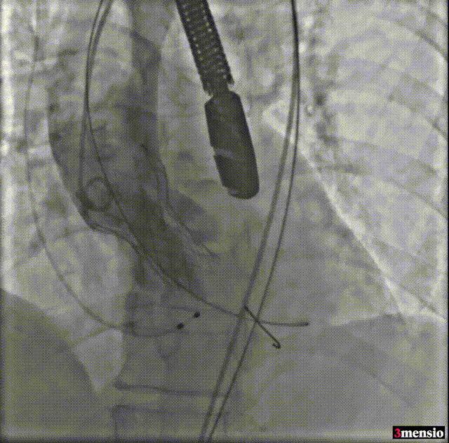 使用沛嘉20mm球囊预扩,预装沛嘉TaurusElite AV23瓣膜,释放高度瓣上0-2mm