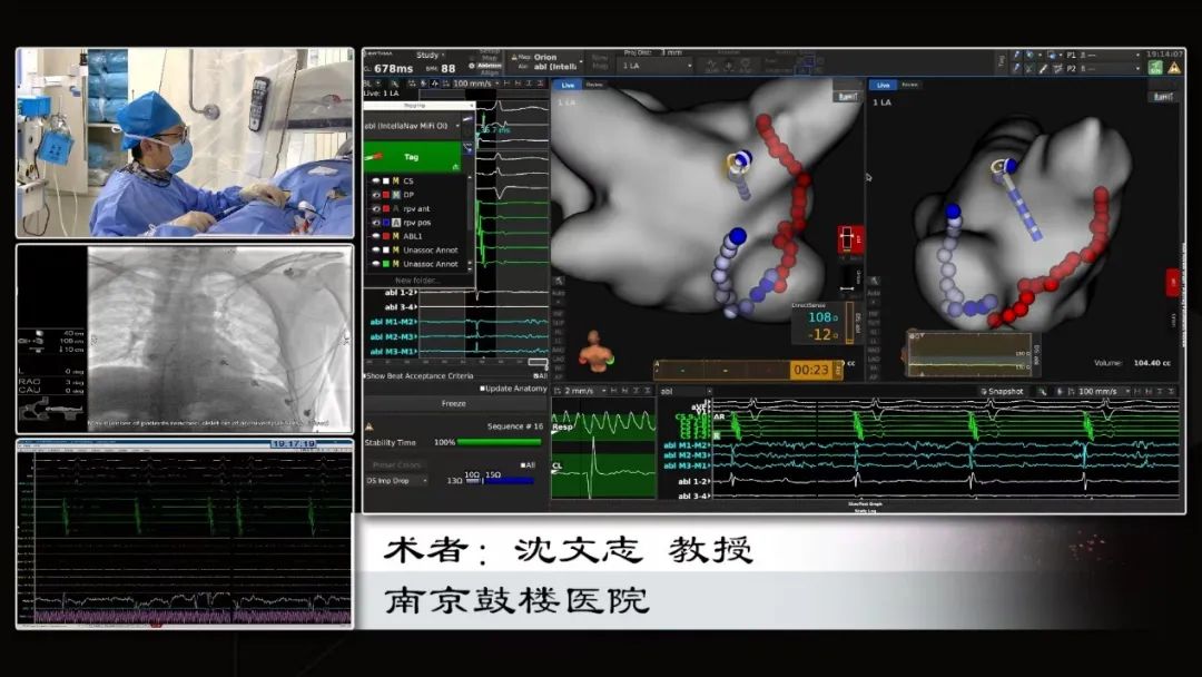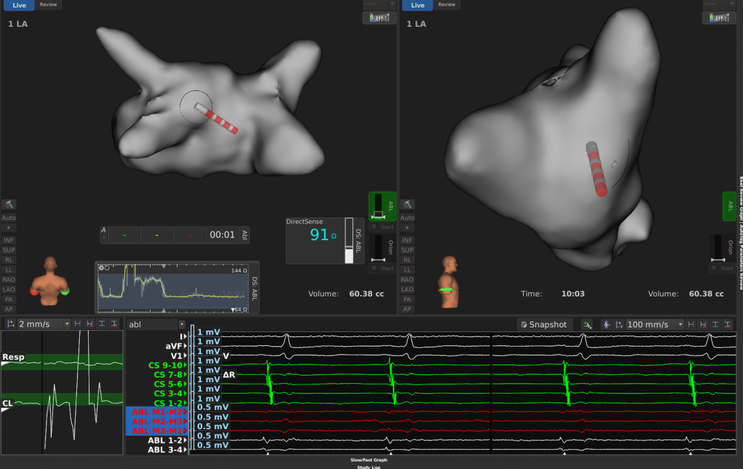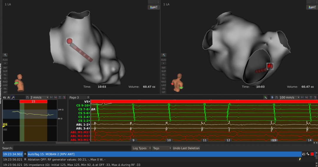3.消融策略:因LPV和RPV肺静脉均有电传导,故决定行环肺静脉隔离(PVI), 本次PVI消融终点:消融中电位明显下降;orion网篮导管,LPV和RPV均阻滞。