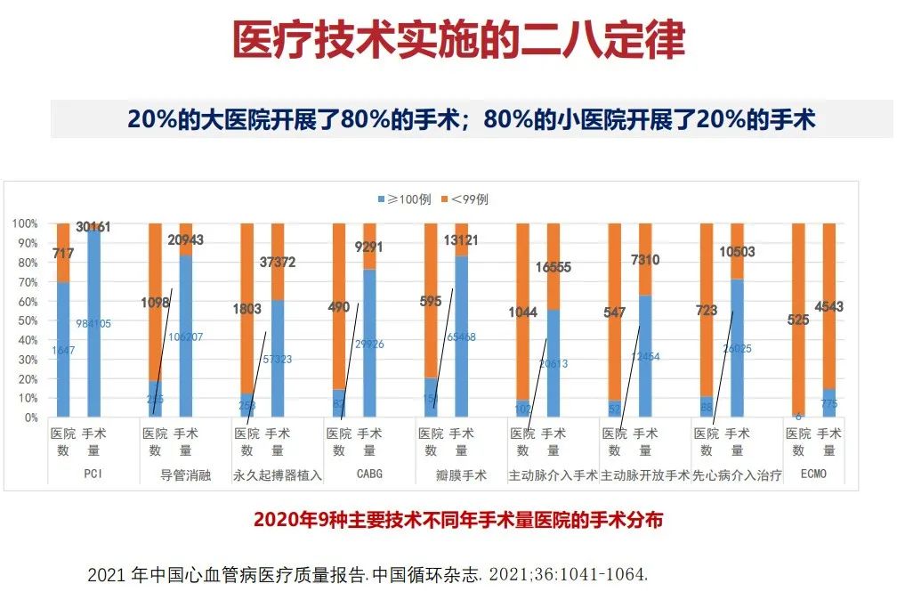 胡院士指出,医疗技术实施存在“二八定律”,即20%的大医院开展了80%的手术,80%的小医院开展了20%的手术,优质资源下沉仍任重道远,需要切实采取针对性措施,提高基层医院的诊疗能力和医疗质量。