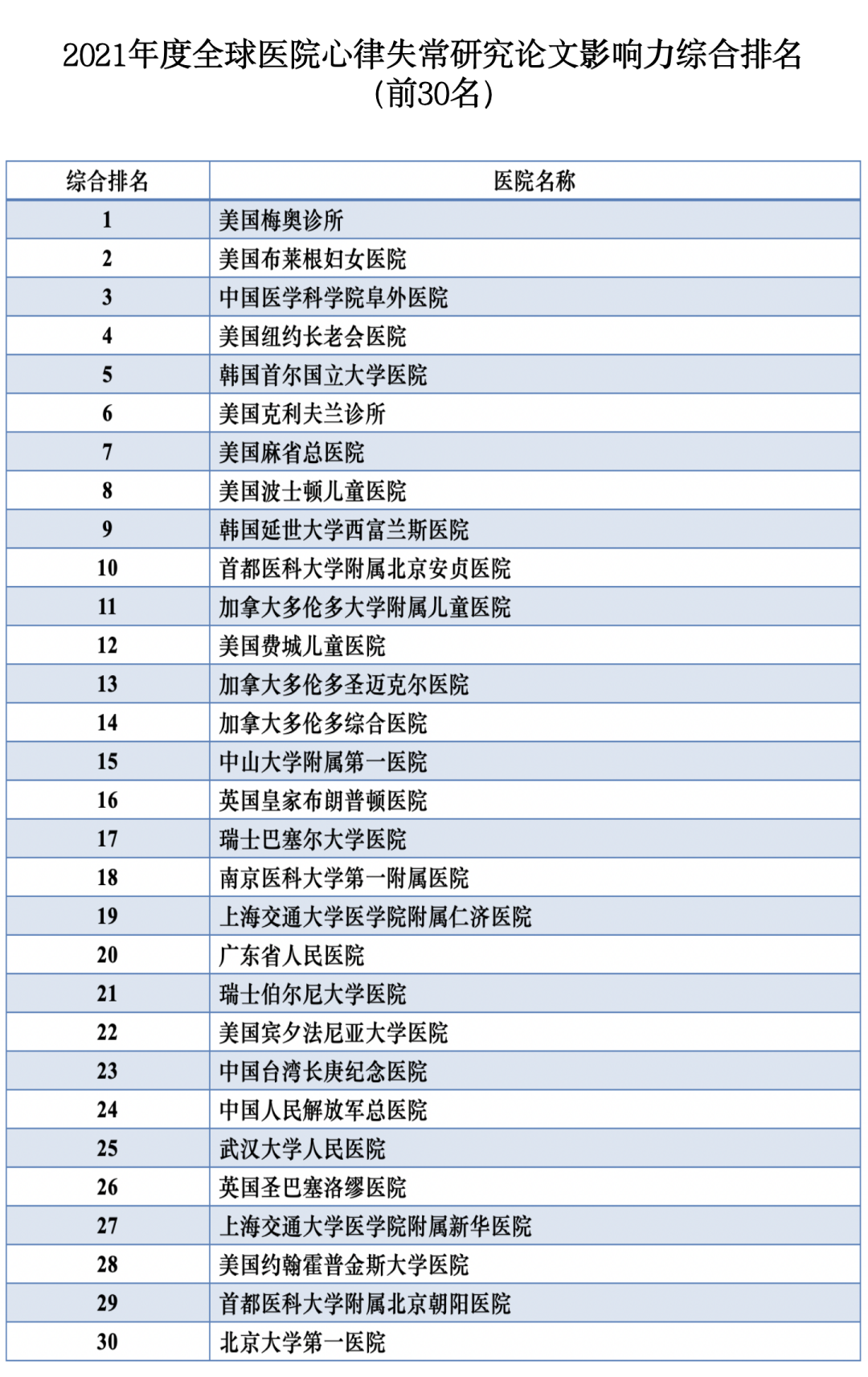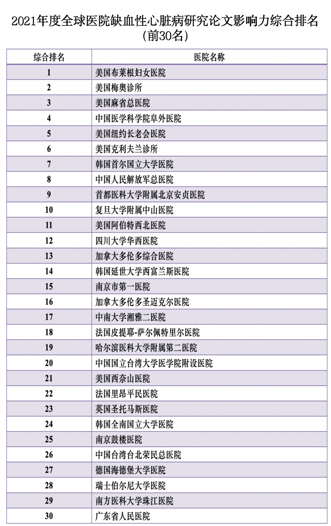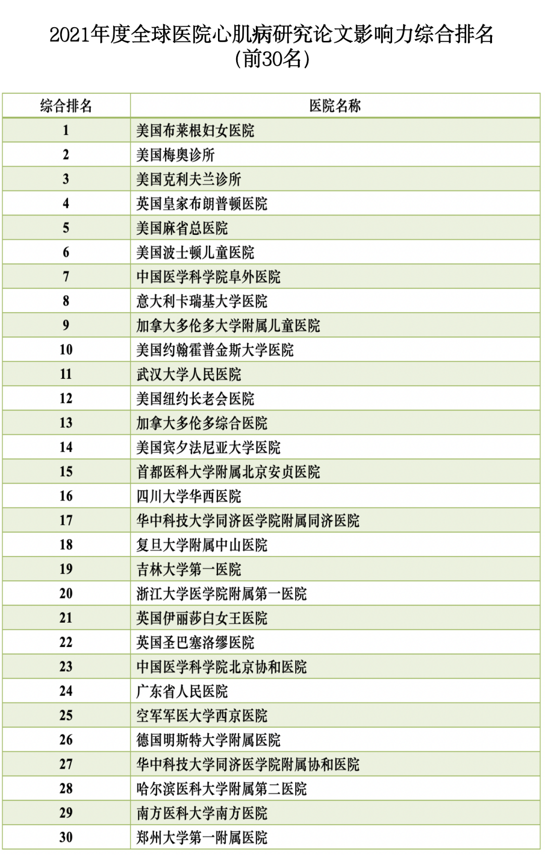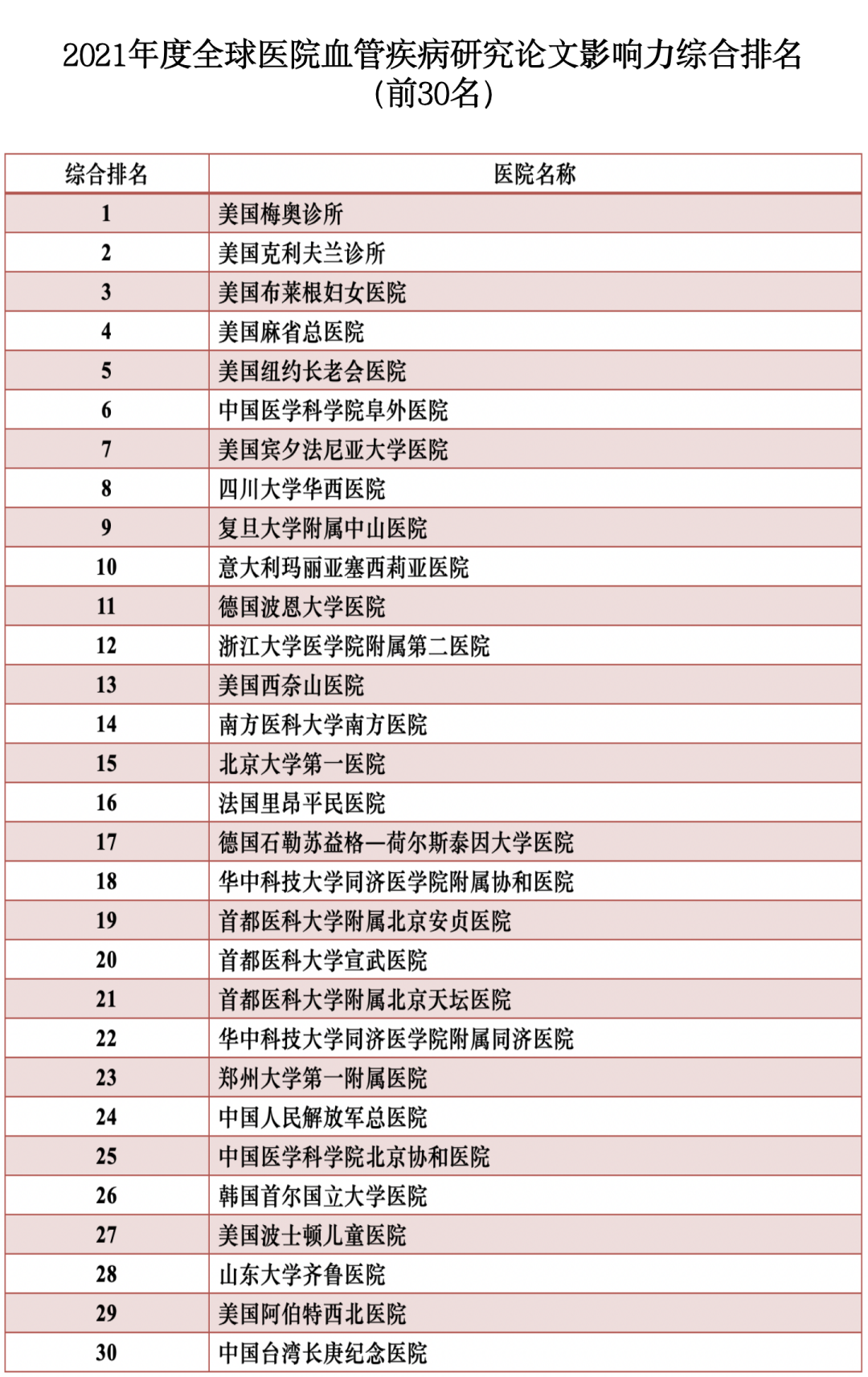 发布2021年度全球医院缺血性心脏病、高血压、血管疾病、心律失常、肺血管、心力衰竭、先天性心脏病、心肌病、瓣膜病研究论文影响力综合排名(前30名)