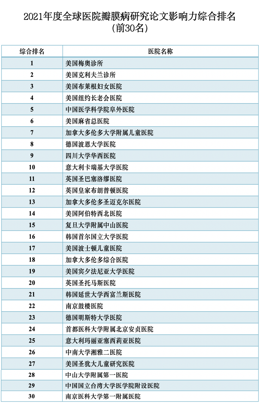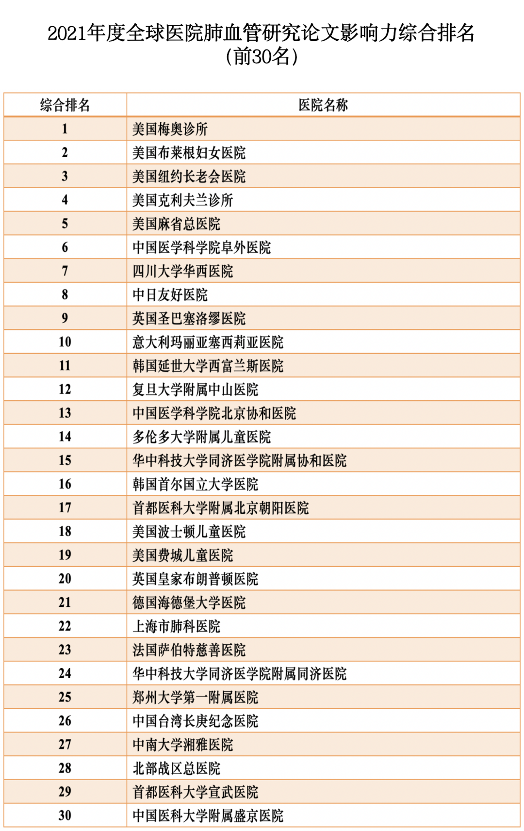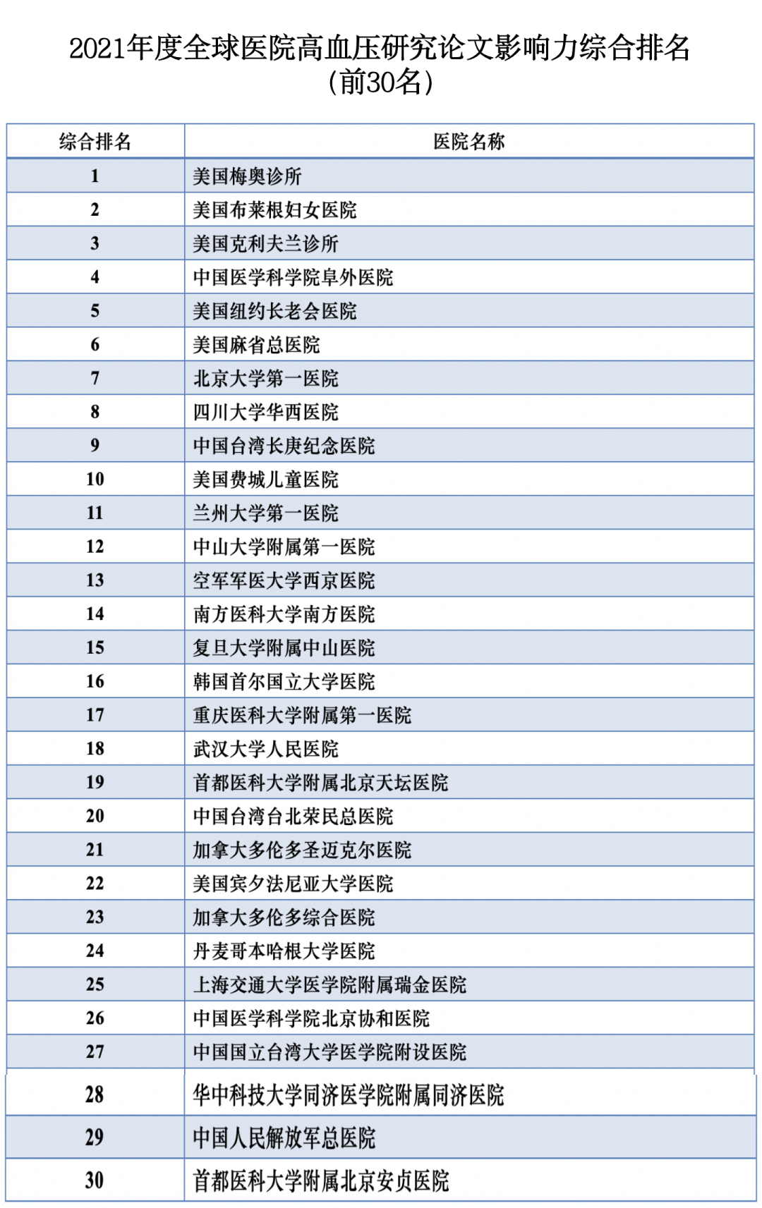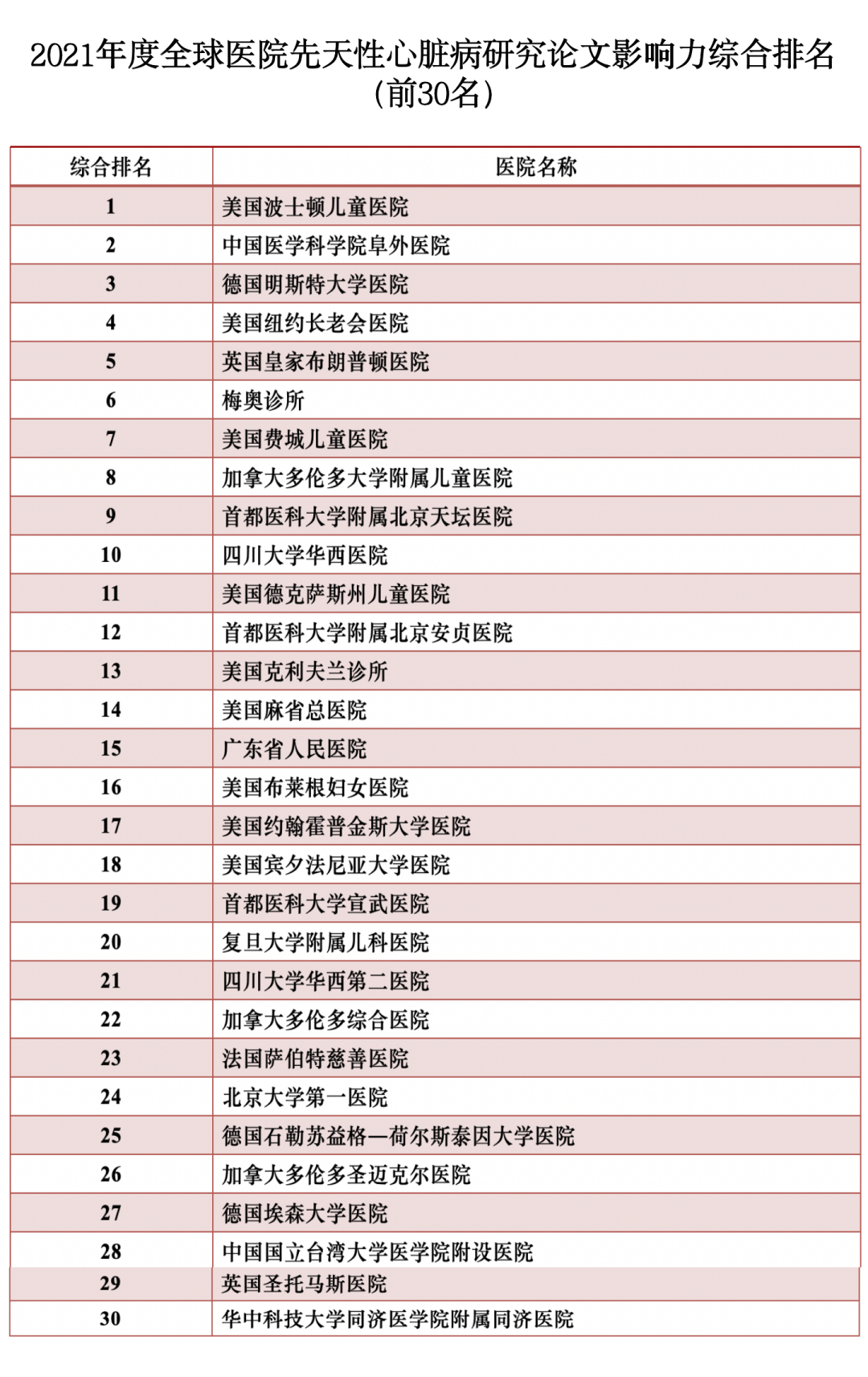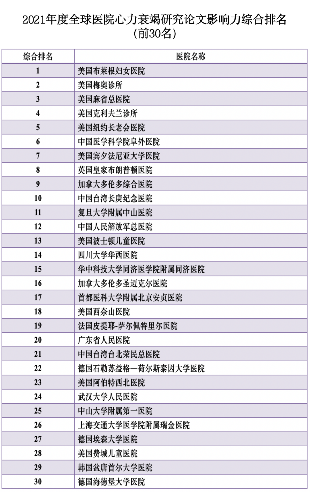 发布2021年度全球医院缺血性心脏病、高血压、血管疾病、心律失常、肺血管、心力衰竭、先天性心脏病、心肌病、瓣膜病研究论文影响力综合排名(前30名)