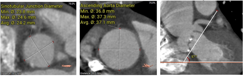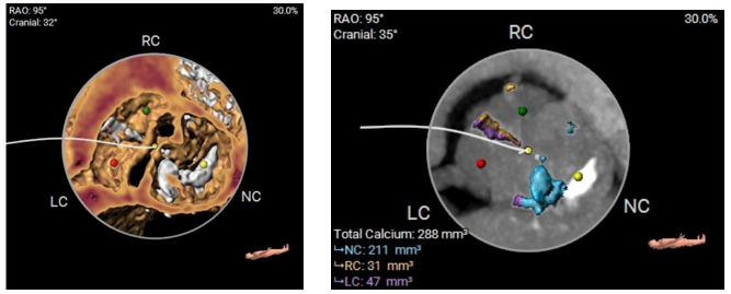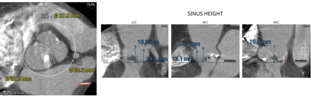 患者重度主动脉瓣狭窄,LVEF 72%,左室舒张末期内径4.4cm,主动脉瓣瓣口功能面积0.5cm²,收缩期主瓣峰值流速为5.26m/s,平均跨瓣压差74mmHg。