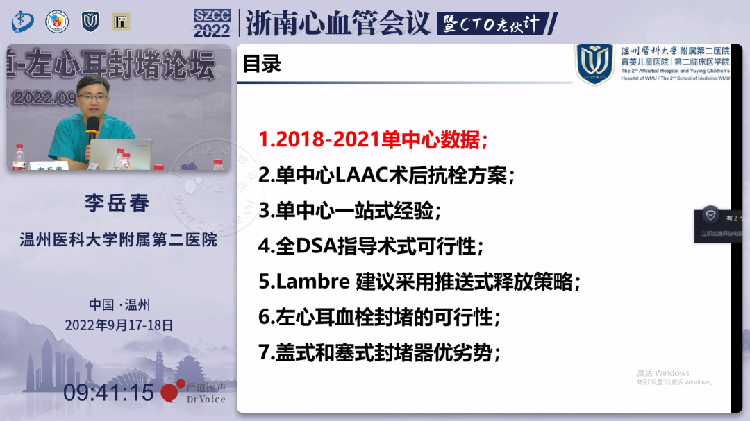 储慧民教授对LAAC手术流程以及不同封堵器操作技巧进行了系统介绍。特别介绍了中国特色术式“LOVE”一站式多中心研究(宁波经验),122例一站式,平均11月的随访,LAAC成功率94.3%,房颤消融成功率76.2%,两例无症状DRT,无死亡,无严重不良事件发生。这一结果表明一站式联合术式安全可行。