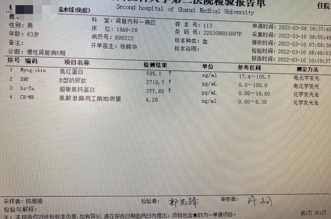 2020年01月09日因胸憋、气紧,伴心悸、咳嗽,就诊于当地医院,行相关检查,考虑肾功能衰竭心力衰竭,遂转入运城市中心医院完善相关检查,考虑“慢性肾脏病5期 心功能不全 心功能IV级 肾性贫血 继发性甲状旁腺功能亢进 2型糖尿病 急性心肌梗死不除外”,给予对症治疗,未进一步行冠脉造影术。