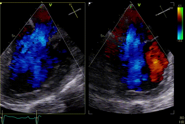 术前TEE显示重度功能性二尖瓣反流,反流位于A2/P2