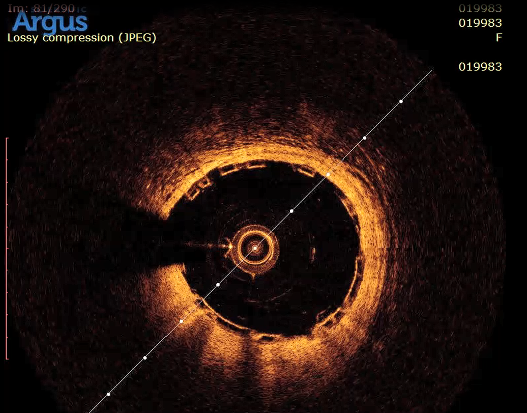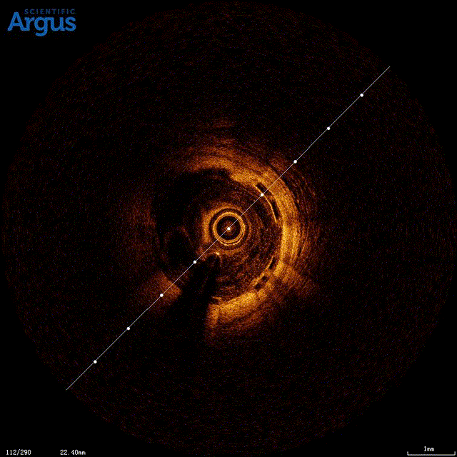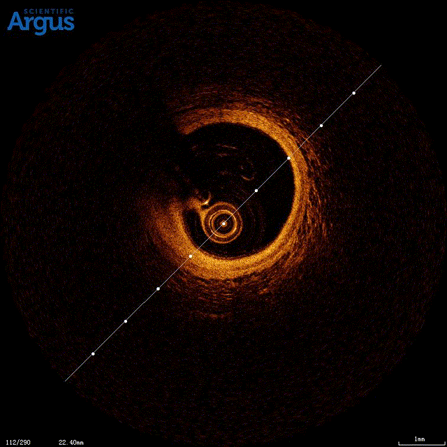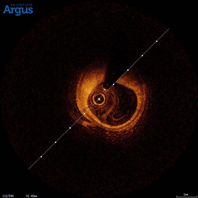 手术过程中,葛均波院士首先分别在LAD及D1各送入一根导丝。随后,为了更为精准地评价冠脉病变性质及严重程度,术者沿LAD导丝将微创阿格斯™OCT成像导管置于LAD中段,回撤成像可以清楚地看到LAD局部斑块负荷重,以纤维脂质斑块为主,管腔局部重度狭窄,病变长度25.4mm,狭窄最重处面积仅1.79mm²。