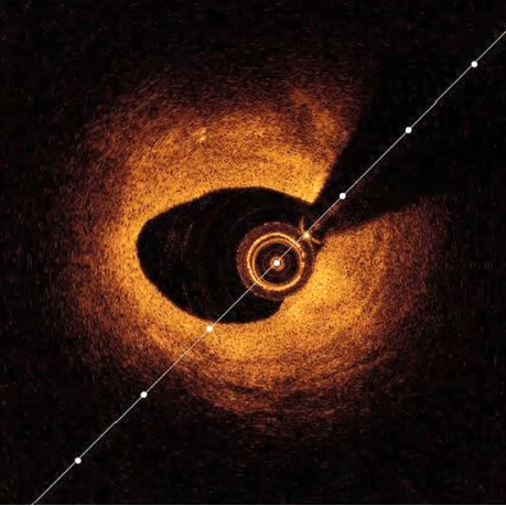 经过过去四十多年,介入心脏病学发展到今天。从最早的PTCA到裸支架,再到药物洗脱支架,下一代完全可降解支架的研发也正在进行中,而我们对介入的理解也一步步接近真相。二十多年前我们就有了血管内超声,腔内影像学的出现对介入治疗起到了非常重要的指导作用。OCT腔内影像技术具有极高的分辨率,即使是目前最好的血管内超声机器,轴向分辨率差不多是100μm,纵向分辨率是250μm;而OCT的轴向分辨率可以达到10μm,使我们可以更准确的了解病变的性质。更重要的是,OCT可以在介入治疗之后,帮助辨别支架贴壁是否良好,尤其是对于下一代完全可降解支架而言,血管内超声的分辨率不足以显示支架与血管壁之间的距离时,OCT可以清楚的勾画出支架的轮廓和血管病变的轮廓。
