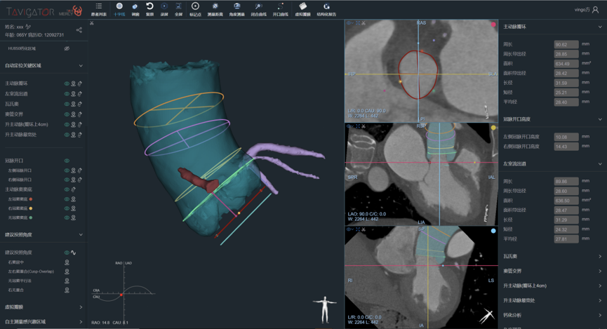 基于Tavigator™系统,医生只需上传主动脉根部CT影像,无需手工干预即可完整实现主动脉根部解剖结构全自动分割与三维重建、瓣叶分型、瓣环及各平面定位测量、冠脉开口高度自动定位测量、瓣环角度分析、最佳投照角度计算、钙化定量分析、左心室容积分析、解剖结构风险提示、瓣膜自动匹配选型建议、动态结构化报告生成。单个影像序列分析时间约一分钟,速度远快于临床医生目前行主动脉根部影像分析需要的几十分钟。在高性能并行计算系统的加持下,更大程度地提升了影像分析效率,极具科研价值和临床意义。