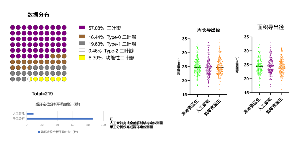 分析统计结果显示,人工智能系统在核心测量指标精度上,都表现出与影像核心实验室高年资医生极高的相关性,且优于低年资核心实验室医生的测量结果;人工智能系统可进行准确的瓣叶分型,且不同分型瓣叶术前影像在核心测量结果上,均表现出与影像核心实验室高年资医生极高的相关性和稳定性;同时,人工智能系统也表现出极强的鲁棒性和良好的数据泛化能力;此外,人工智能在确保分析精度的同时,分析效率显著高于手动分析。