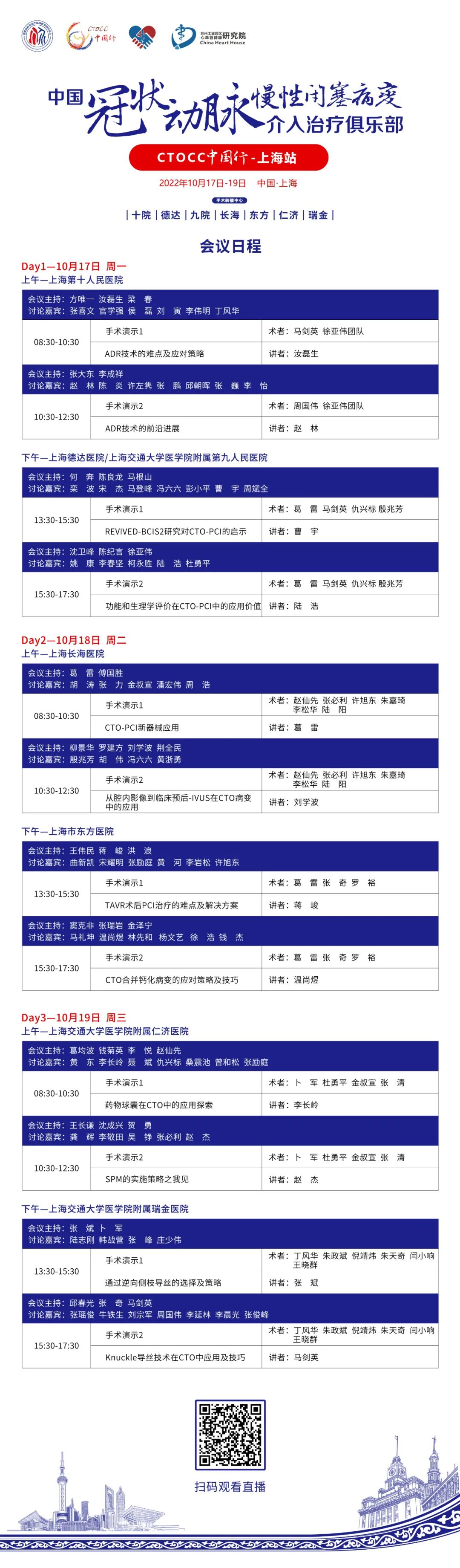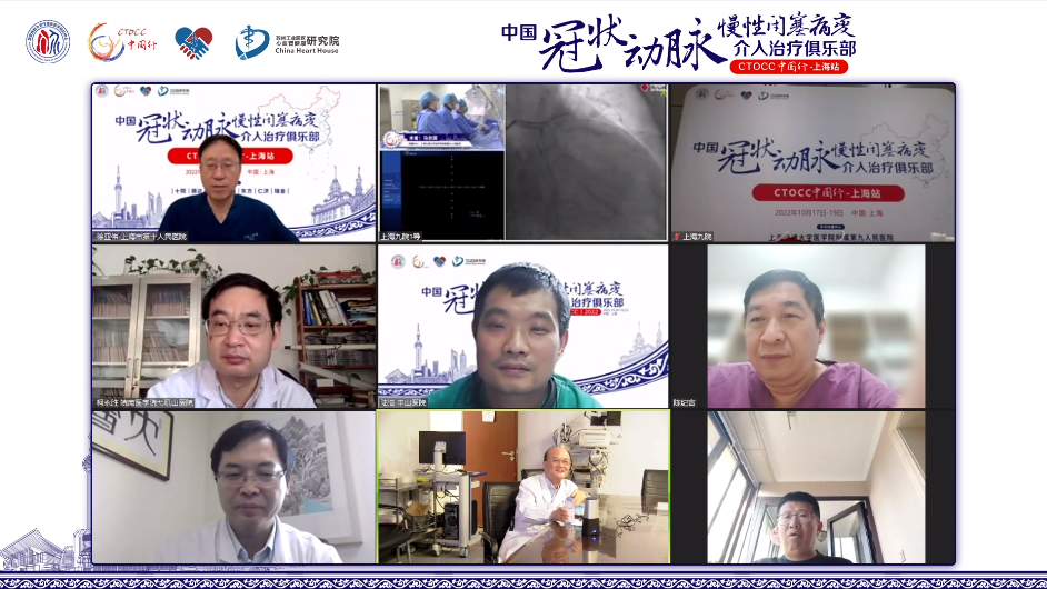 2022年10月17日,“CTOCC 2022中国行·上海站”迎来首日“开门红”!全平台在线观看量30000余人次,直播演示在上海市第十人民医院和上海交通大学医学院附属第九人民医院两家医院进行,共开展7台高难度CTO-PCI手术。