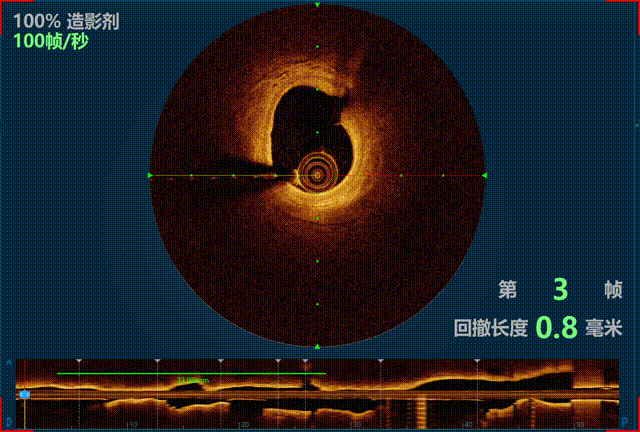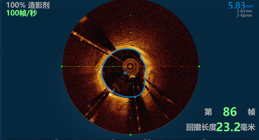 再行 OCT 检查示(图7)支架贴壁良好,无夹层及血肿,最小管腔面积4平方毫米。