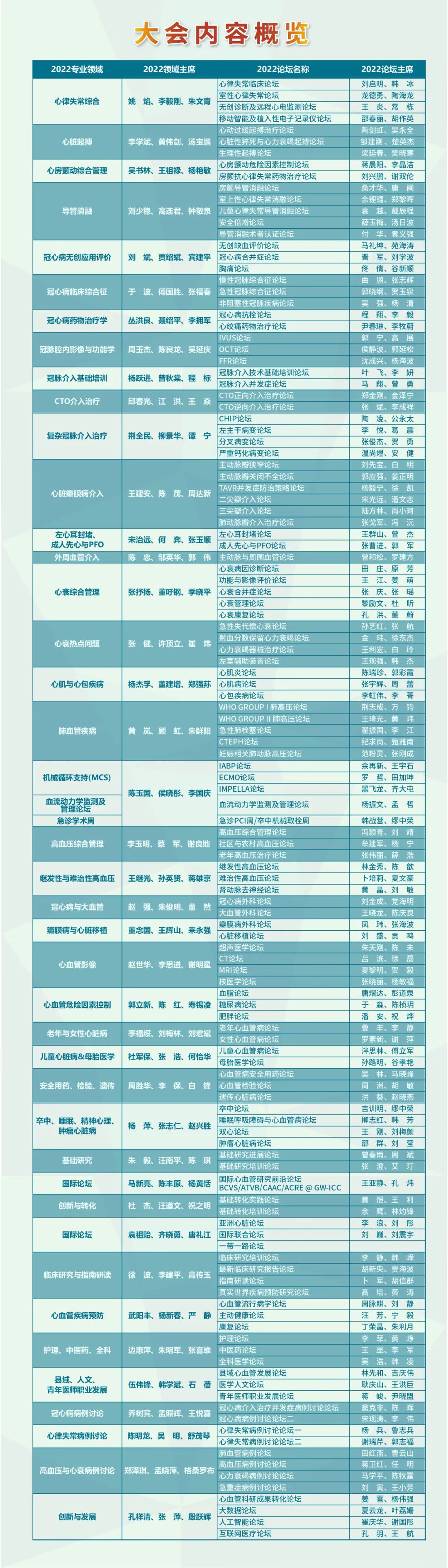 “连续1周”的会期,近千场不同类型的学术活动,将涉及更广阔的领域、更丰富的学术内容,包括糖尿病、脑血管、肾病、老年病、全科医学等心血管相关交叉学科。每个论坛均为“双坛主”负责制,论坛内容丰富多彩,聚焦热点内容!