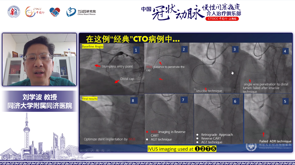 刘学波教授结合病例,分享了IVUS在CTO病变中的应用经验。在CTO病变中,IVUS在寻找闭塞病变起始部位,判断及探寻真腔,测量参考血管直径及病变长度,指导支架选择起到了非常重要的作用,特别是逆向导丝到达近端纤维帽必须应用IVUS。在临床中,IVUS可以尽早介入,通过观察影像帮助我们完善手术治疗策略,节省反复试探的时间,为患者带来切身利益。