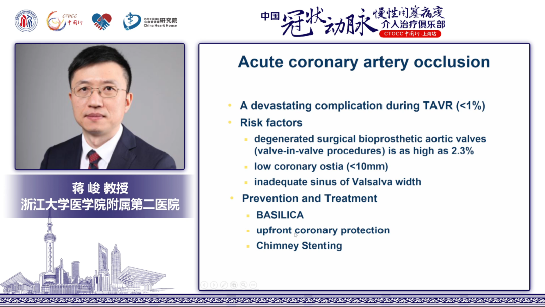 蒋峻教授介绍了TAVR术后PCI治疗的难点及解决方案。蒋峻教授认为,冠心病本身并不增加TAVR患者的死亡率,但是若合并有严重冠心病则会导致死亡率增加。TAVR术中发生急性冠状动脉闭塞的风险很低,但是一旦发生往往带来灾难性后果,可以采用BASILICA技术、上游冠脉保护以及烟囱(Chimey)支架技术进行预防。计划外PCI通常发生于TAVR术后1周,可使用SAL指引导管、MP指引导管,可在Guidezilla以及IVUS等技术辅助下完成。