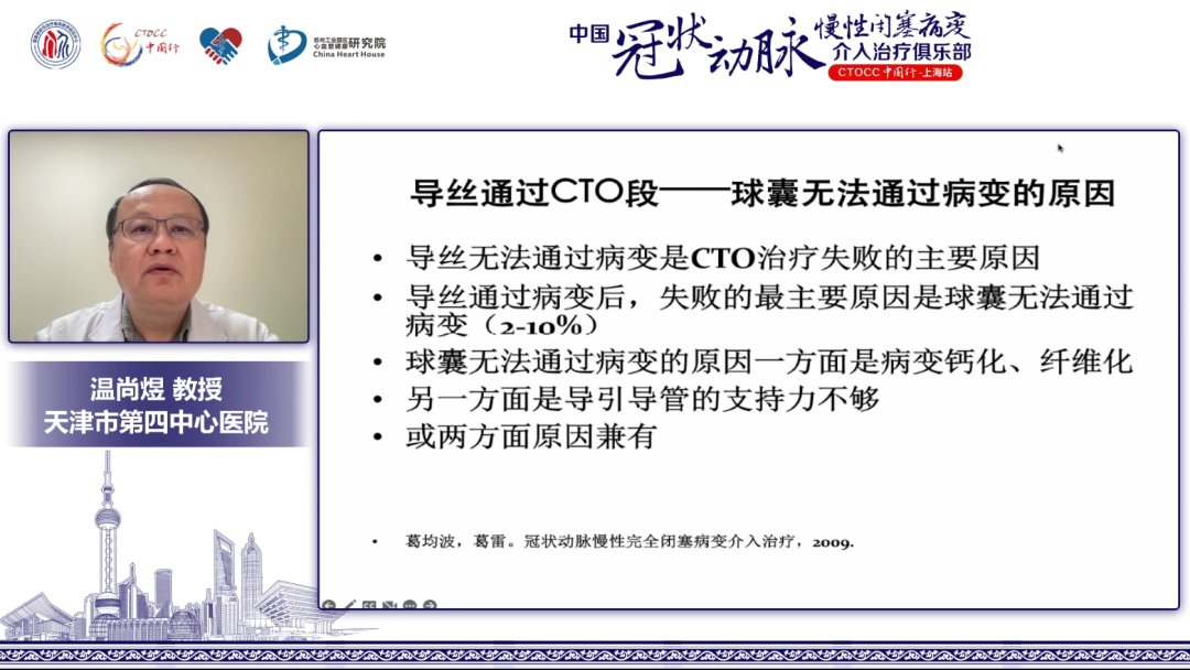 温尚煜教授就临床病例分享了《CTO合并钙化病变的应对策略及技巧》。在CTO介入治疗中常见的失败原因是导丝无法通过病变,其次是球囊无法通过,最后是不能扩张病变。在CTO病变中有相当一部分患者合并重度钙化,在对合并血管钙化的患者行腔内介入治疗时,往往会出现导丝的通过困难,管壁的弹性回缩同时容易发生夹层及远端栓塞等并发症。因此在对严重钙化CTO病变进行治疗时,术前全面评估尤为重要,准备多种入路和开通方法,同时要明确目标血管的开通和腔内治疗。术中灵活转变策略,结合使用多种开通器械。