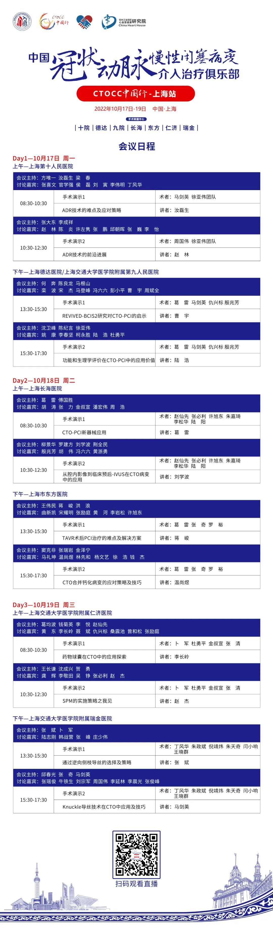 2022年10月18日,“CTOCC 2022中国行·上海站”第二日精彩继续,全平台在线观看量70000余人次,直播演示在上海长海医院和上海市东方医院两家中心进行,成功攻克6台高难度CTO-PCI手术。
