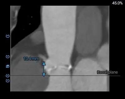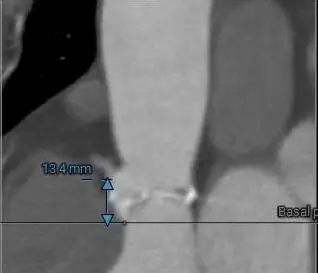 1.三叶式主动脉瓣,中重度钙化,人工瓣膜锚定力尚可,左室流出道呈敞口型,综合多平面分析,预估瓣膜释放后有向下位移风险及瓣周漏可能