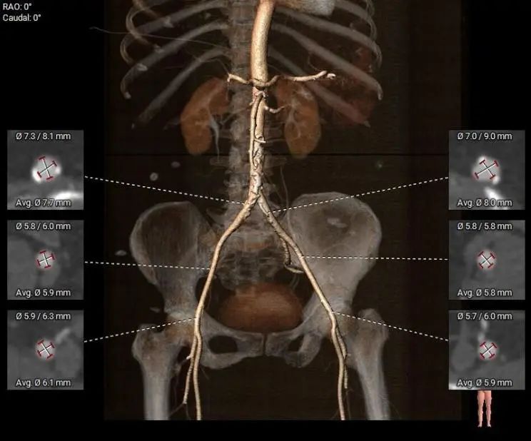 腹主动脉及左右髂总动脉有附壁钙化分布,左右髂外动脉及左右股动脉血管内径稍细,余血管内径可