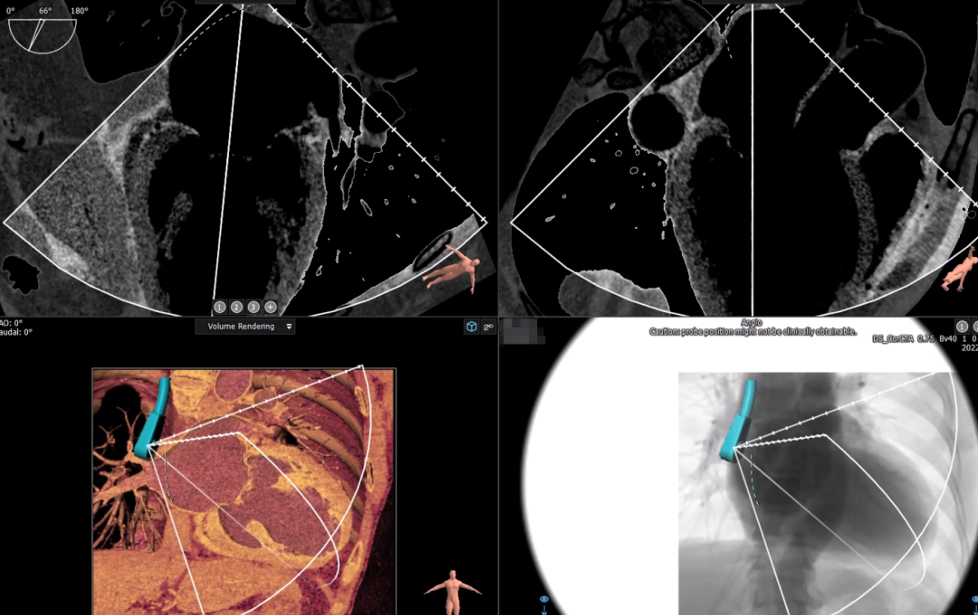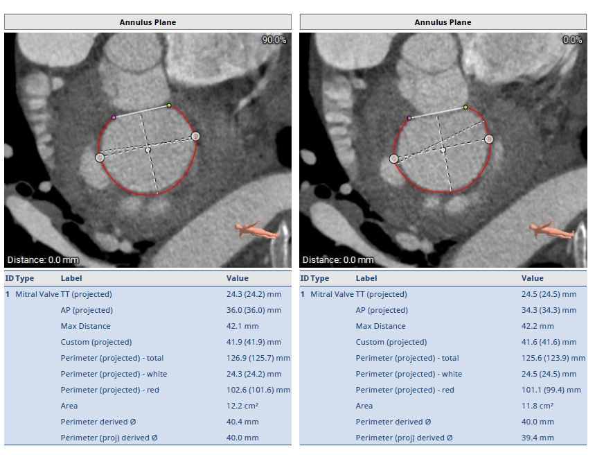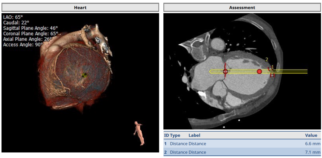 经过瑞金医院心外科MDT团队综合讨论评估该患者病情后,患者为重度FMR患者,为传统外科手术极高危患者,决定进行MitraFix®经心尖二尖瓣植入。术前心脏CTA瓣环面积折算最大直径41.5 mm 模拟植入34号二尖瓣瓣膜, 心室Neo LVOT面积可。