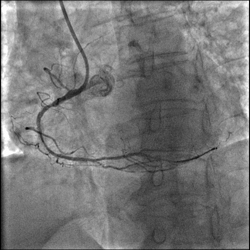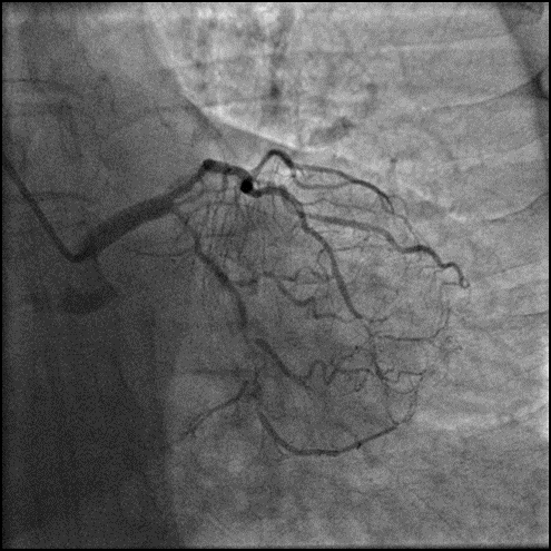 右冠状动脉近段、中段、远段,狭窄程度70-90%,病变长度弥漫性,严重钙化,TIMI III级;