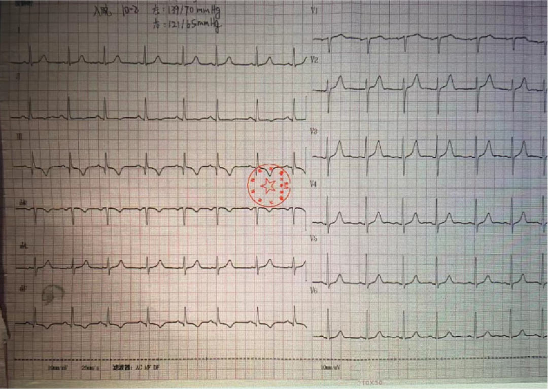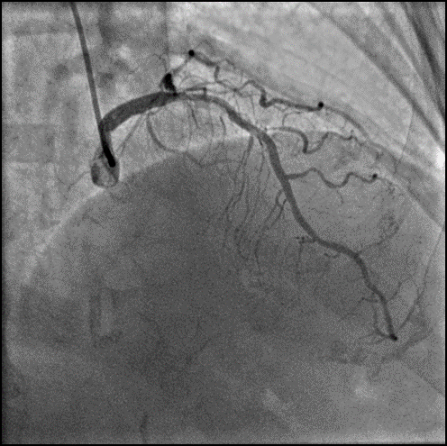 左前降支近段、中段,狭窄程度50-70%,病变长度弥漫性,严重钙化,TIMIⅢ级:第一对角支开口病变,狭窄程度70-90%,病变长度局限性,TIMI Ⅲ级。