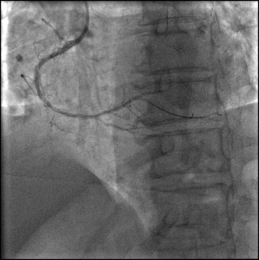 右冠状动脉后降支,狭窄程度70-90%,病变长度管状性,TIMI II级;后侧支,狭窄程度50-70%,病变长度弥漫性,TIMI III级。