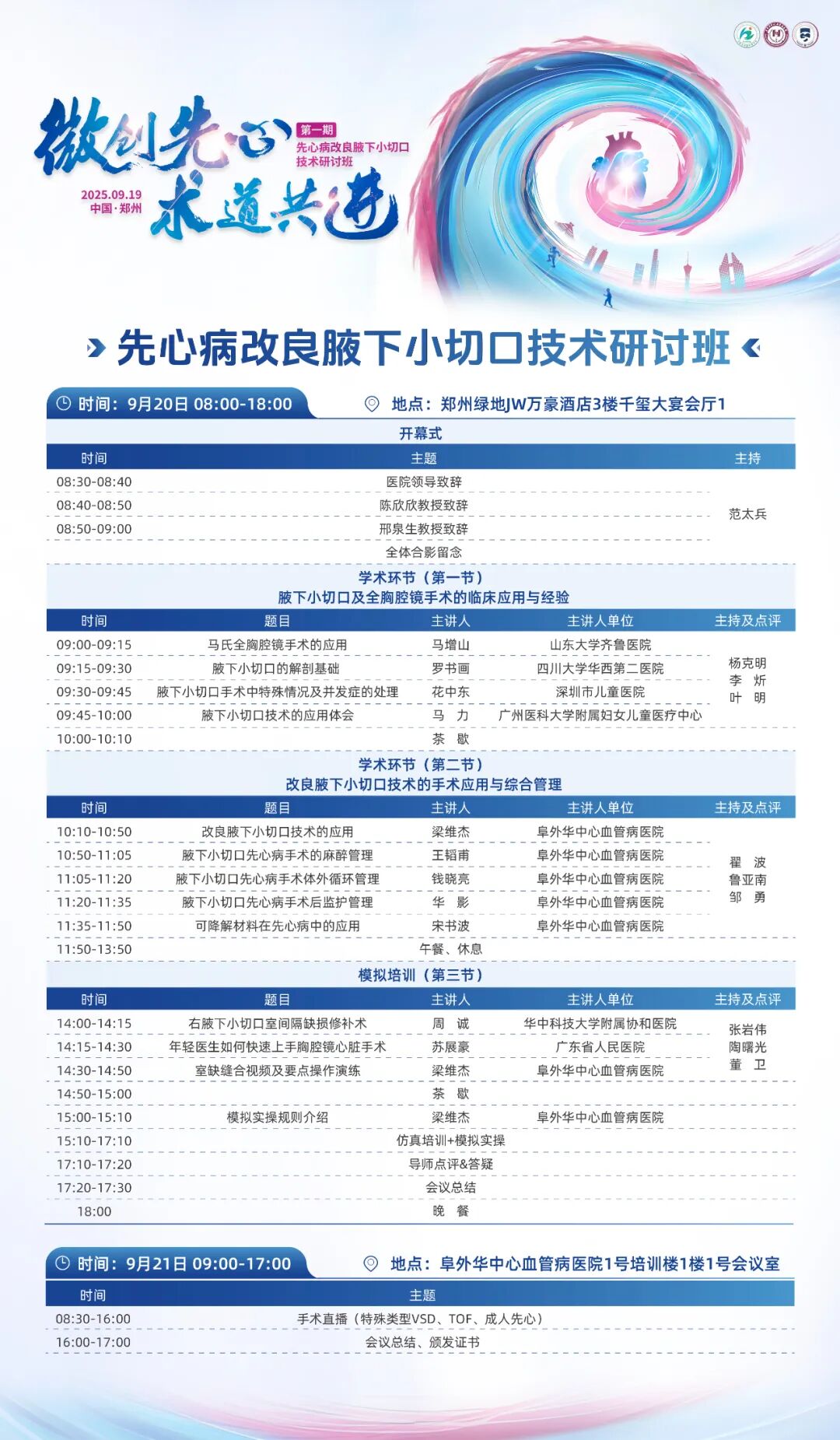 为此,我们诚挚邀请您参加将于2025年9月19日-21日在郑州举办的“先心病改良腋下小切口技术研讨班”。本次研讨班将集结国内同道,群策群力,深入交流技术经验,探讨未来方向,推广技术,培训青年医师,携手推动中国微创先心外科技术迈向更高台阶。