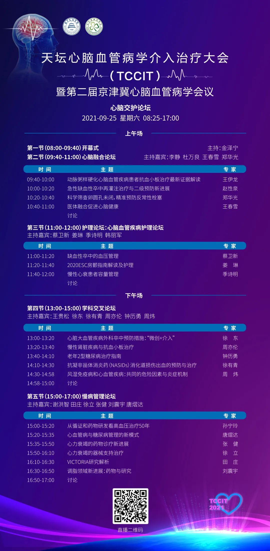 由北京健康促进会、首都医科大学附属北京天坛医院的神经心脏中心、心脏及大血管病中心主办的天坛心脑血管病学介入治疗大会(TCCIT)暨第二届京津冀心脑血管病学会议将于2021年9月25日通过线上结合线下的形式召开,秉承“与时俱进 精益求精”的初心,本次TCCIT将继续与全国各地学者共同探讨心脑血管的介入治疗交叉联合,互相促进新时代发展之路。